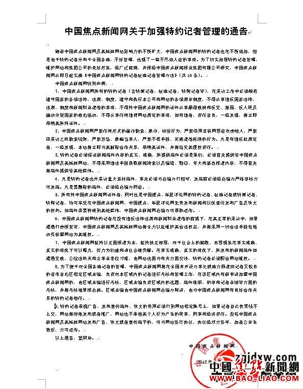 随着中国焦点新闻网及其姊妹网站影响力的不断扩大,中国焦点新闻网的特约记者也在不断增加,但是由于特约记者分布于全国各地,不好管理,出现了一些不尽如人意的事情。为了切实加强特约记者管理,维护网站和集团公司的良好形象,经广泛磋商,并报经中国焦点新闻报业集团有限公司研究,中国焦点新闻网从即日起实施《中国焦点新闻网特约记者驻地记者管理办法》(共16条)。