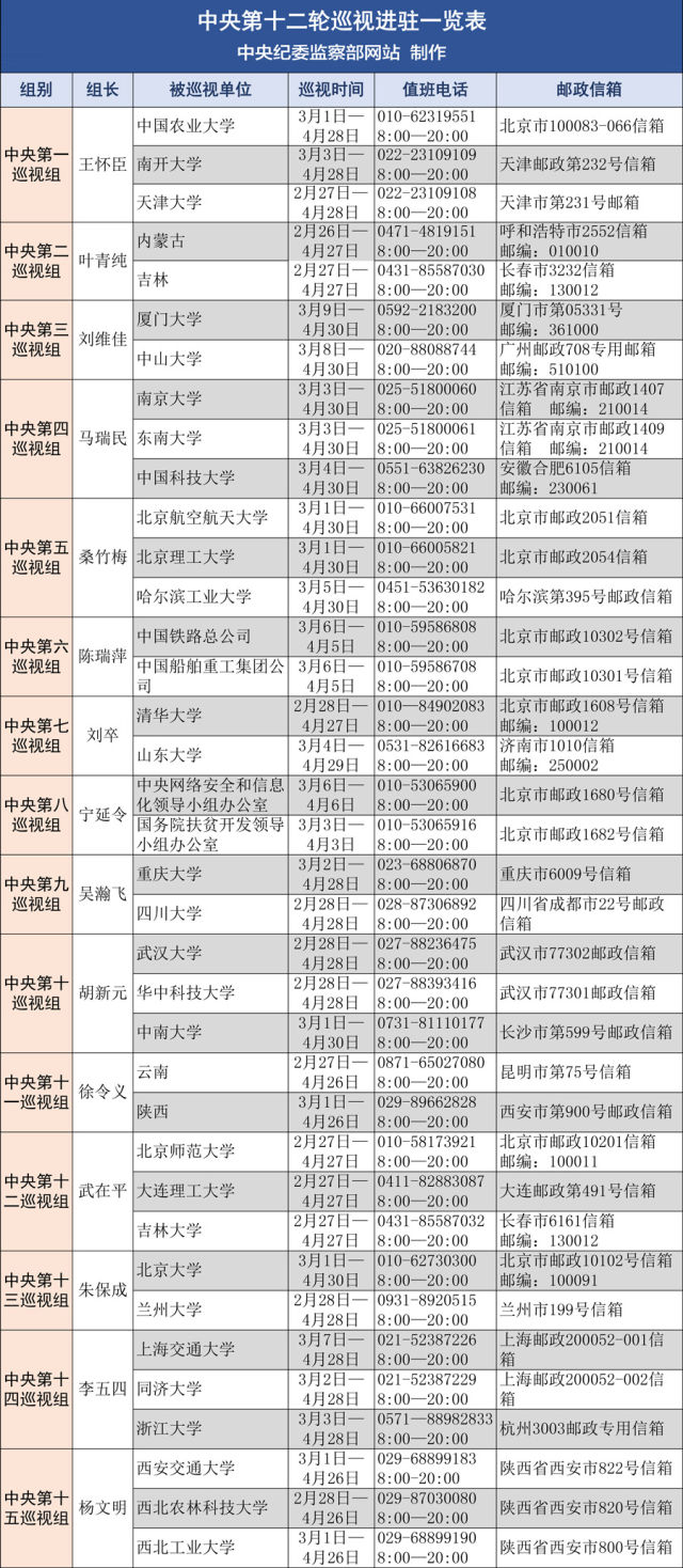 电话邮箱一览表,中央第十二轮巡视全部进驻