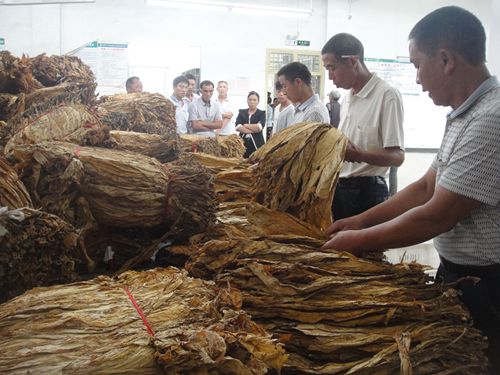 图为县烟草公司专业人员正在检查烟叶