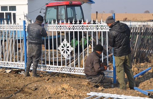图3为该 场正在积极地义务帮助生产队居民安装铁栅栏,美化家园;