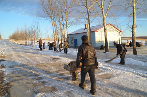 图4为该场职工群众看到党的惠民政策给他们家园带来的翻天覆地变化,心存感激,自发地走上街头打扫 队区卫生和积雪。(周旭友摄)