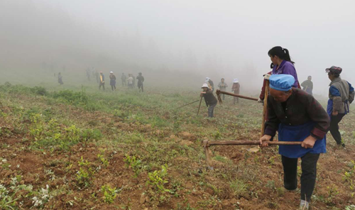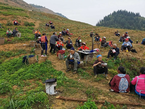 村支书袁纯贵介绍道,大头坡村按照‘党支部+合作社+农户’的经营模式共发展了高山有机茶园736余亩,全村大量的闲置土地充分利用起来了,等到茶园丰产后全村将发生翻天覆地的变化。当前,管护正当时,他与村两委干部积极组织村民、特别是贫困户积极参加,确保了贫困户就近务工创收,茶园管理严禁施用除草剂、农药和化肥,茶叶后期品质提升。