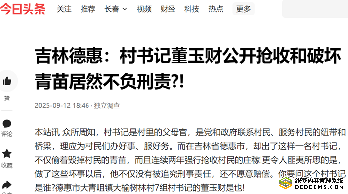 本站讯 众所周知,村书记是村里的父母官,是党和政府联系村民、服务村民的纽带和桥梁,理应为村民们办好事、服好务。而在吉林省德惠市,却出了这样一名村书记,不仅偷着毁掉村民的青苗,而且连续两年强行抢收村民的庄稼!更令人匪夷所思的是,做了这些坏事以后,他不仅没有被追究刑事责任,还不愿意赔偿。你要问这个村书记是谁?德惠市大青咀镇大榆树林村7组村书记的董玉财是也!