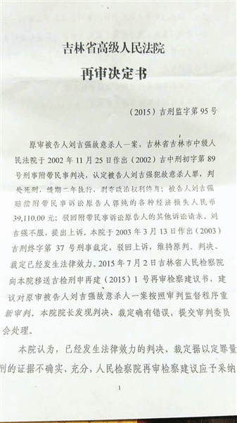 律师、退休的检察官和原吉林省高院副院长先后为他做无罪辩护,最终以失败告终,刘吉强被以故意杀人罪名判处死缓。北京青年报记者昨日独家获悉,吉林省高院近日决定再审此案。
