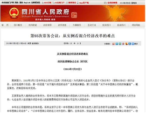 在2015年7月22日的会议上,四川省律师协会会长刘守民就“高蓉挪用公款一案”以案说法,本次会议由魏宏省长亲自主持。7月23日四川省人民政府官方 网站就案例刊发文章一篇,标题《第93次常务会议:从实例看混合经济改革的难点》来源省法制办。案例简介:2003年3月27日中华总公司与以王英(均系 化名)为代表的七名自然人签订《协议书》(简称03协议)进行合作。合作包括两个阶段:第一阶段是“关于境外项目的运作”及其相关事宜;第二阶段是“关于 中华西南公司的改制重组”。截至案发,改制目标尚未完成。