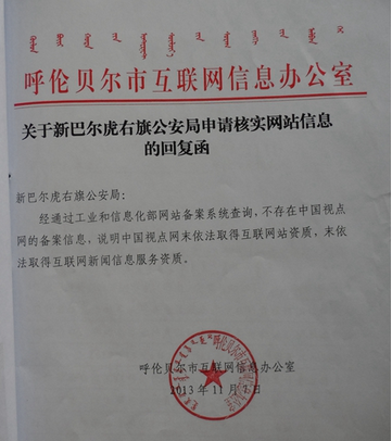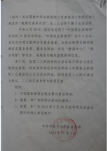 根据卷宗,被告定性李广军、张雷所持证件是假证的依据是呼伦贝尔市委宣传部《关于新巴尔虎右旗公安局申请核实记者证件的回复函》。这份《回复函》称: “李、张所持有的记者证不属于国家新闻出版总署签发的证件”。“我们还通过中国记者网核验二人的身份,登录中国记者网后输入持证人的姓名、单位、身份证号 码或统一编号当中的任何两项,没有二人的信息页”;“国家关于境外记者采访服务管理工作有关规定‘境外媒体记者持有的证件’明确规定:港澳地区常驻记者持 ‘港澳新闻机构常驻内地记者证’,港澳地区记者短期(临时)采访需持中华全国新闻工作者协会(中国记协)制发的‘港澳记者采访证’。此二人证件不属于此类 证件。今年6月2 8日,国信办关闭了‘中国焦点新闻网’在内的3 1家非法网站。‘中国焦点新闻网’为个人主办,未依法办理互联网信息服务备案,未依法取得互联网新闻信息服务资质,属非法网站”;“李广均、张雷二人所持 有的记者证均不符合上述正规持证资质,同时其所持证件所在网站(中国焦点新闻网)已被国家认定为非法网站,因而鉴定二人的记者证为假证、二人的记者身份为 假冒记者。”