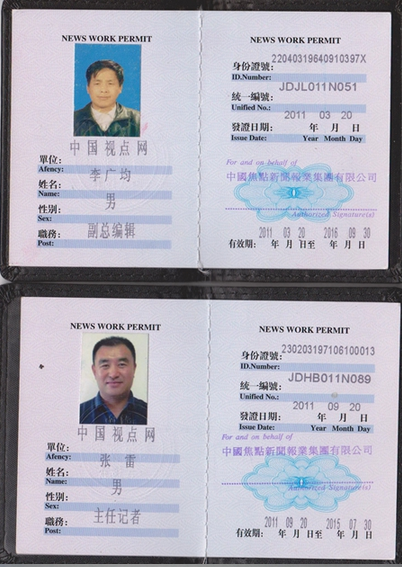 对此,原告辨称:新闻出版署《新闻记者证管理办法》明确规定,署证(新闻出版署所发)是境内记者采访的合法证件,强调的是“境内”,这一办法在其附则里明 确规定“国外及香港、澳门、台湾新闻机构的人员在境内从事新闻采访活动,不适用本办法。”《香港澳门记者在内地采访办法》第七条明确规定:“港澳记者可以 通过有关部门指定的服务单位聘用内地居民从事辅助工作。”原告还强调:截止目前为止,中国没有任何一条法律禁止国外和港澳台媒体在中国聘用内地居民从事记 者或特约记者工作,世界很多国家都在中国大陆聘用了大量记者,同时中国媒体也在国外聘用很多外国人做记者,我们公司是在香港注册的新闻企业, 在内地聘用记者并不违法。港澳新闻机构常驻内地记者证或港澳记者采访证只是在内地采访的临时、辅助证件,原告没有携带或者办理此证件,只能算是违规,不能 因此就否定公司所发证件的真实性,更不能证明其持有的中国视点网证件就是违法证件或假证。原告在强调上述事实的同时,出示了香港大公报和香港民生报工作 证、记者证的扫描打印件,并以民生报记者施玉群在新右旗的采访作为佐证。据2013年12月16日《民生报》BI版文章《内蒙古新巴尔虎右旗:再舞公权大 棒》记载:2013年12月,施曾经持香港媒体民生报所发记者证采访过新右旗委宣传部副部长苏风宁(本案的主要证人),当时施记者曾经问苏:“对本报记者 身份是否怀疑”?对方很肯定的说:“对你们的身份我是相信的。”当原告在庭审中以这个旁证证明香港媒体没有携带并出示港澳新闻机构常驻内地记者证或港澳记 者采访证也可以采访时,被告没有做出反映。据原告后来了解,施玉群记者不仅在新右旗采访苏副部长时,没有携带和出示港澳新闻机构常驻内地记者证或港澳记者 采访证,只是出示了民生报自己发放的记者证,而且至今也没有办理此两证却依然在全国各地采访,但并没有任何部门指责其证件是假证或违法。原告同时还强调: 而且我们根本就没有采访,只是要求旁听,当时苏风宁还曾经说过:如果你们需要采访,我可以帮助联系。即使是我们采访了,最多只能算是违规,而任何法律包括 《香港澳门记者在内地采访办法》也没有规定违规采访就可以拘留。