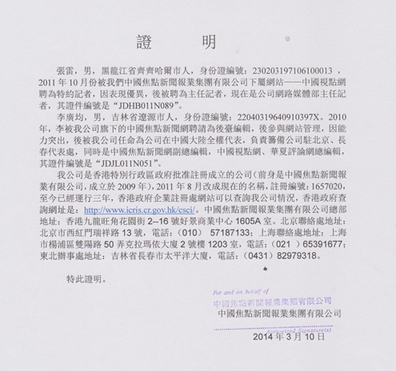 中国焦点新闻报业集团有限公司证明了李广军、张雷的身份和公司情况