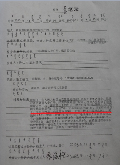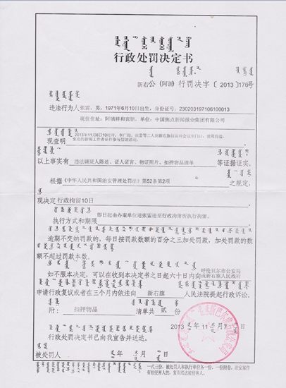11月7日,阿拉坦额莫勒镇第一派出所以涉嫌“使用工作证件不实”为由,传唤了张雷和李广军。同日,办案人不顾二人的申辩,分别对张雷和李广军作出行 政拘留10天的行政处罚决定,并即刻强制执行,拘留的理由是“使用伪造、变造工作证件参与信访活动”。在张雷、李广军被强制行政拘留期间,警方拒绝家属探 望,拒绝会见律师,拒绝任何亲朋探视,并多次对二人进行提审。经过十天的审查,新右旗警方没有查出来任何问题后,不得不将此二人释放。