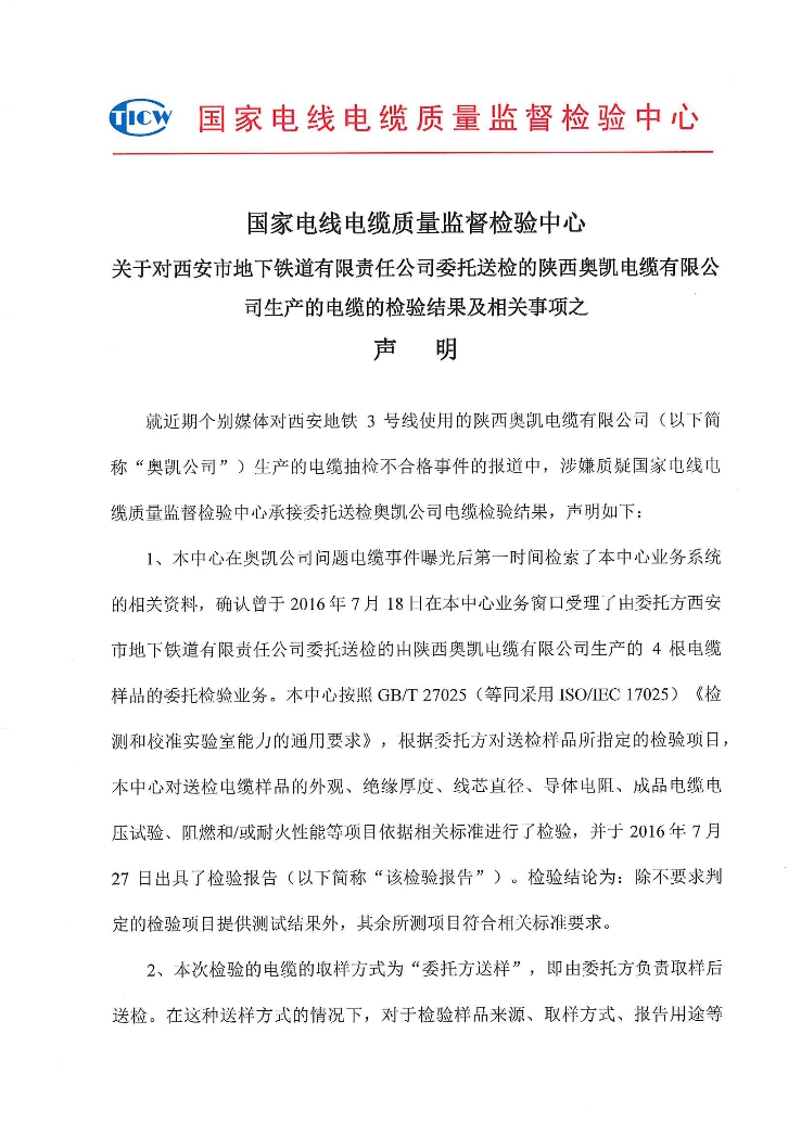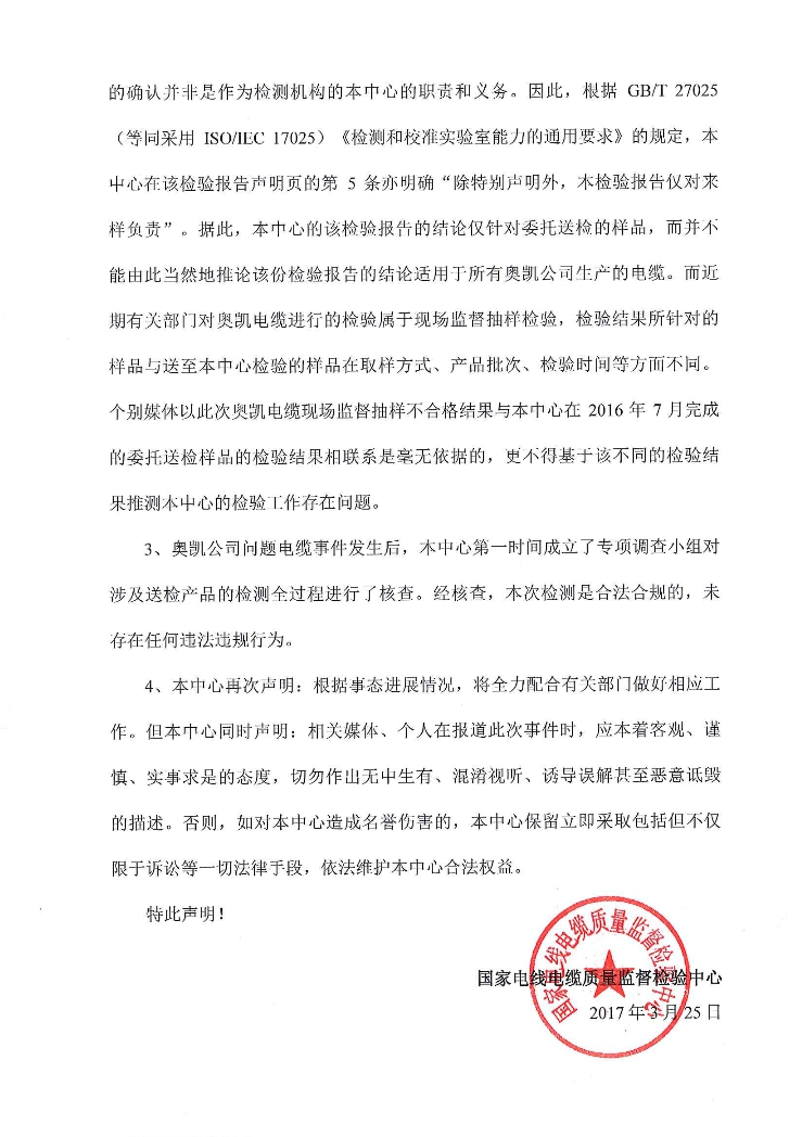 同时检测中心声明中表示,检测机构仅对送检来样负责。因取样方式、产品批次、检验时间等因素的不同,不能将“奥凯”电缆现场监督抽样不合格与此前2016年7月的委托送样检测结果相关联。