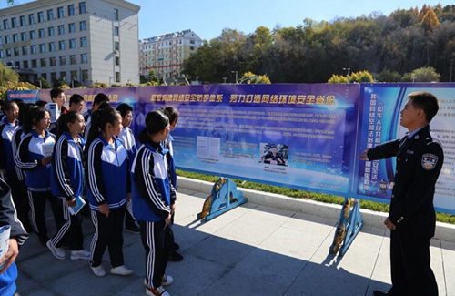 分局刑侦大队、政治处民警于15日上午7时,在白石山林业局广场架设展台,铺设展板,悬挂宣传条幅,并利用广场LED大屏幕播放网络安全主题警示片,利用微博、微信公众号等平台集中发布网络安全宣传信息,为分局网络安全宣传周活动营造出良好氛围。