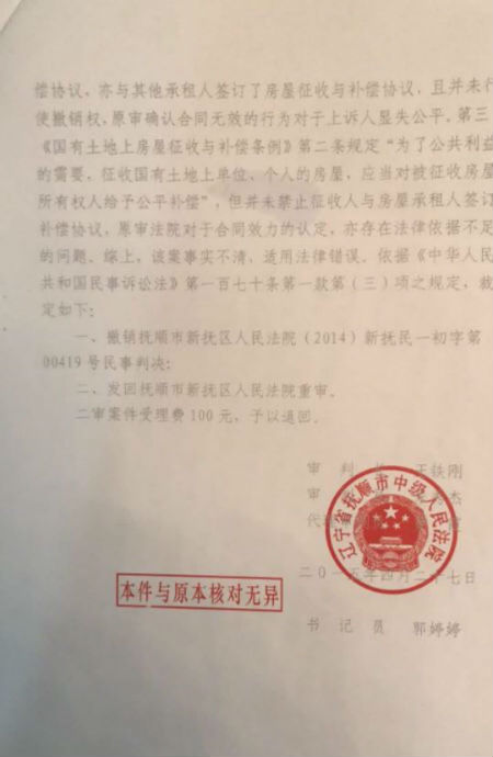 2013年4月24日,甲方新抚区房屋征收与补偿管理办公室(征收人)与乙方宁玉媛(承租人)签订了“万达西项目非住宅承租人补偿协议”,2014年11月18日,抚顺市新抚区人民法院主审法官冯国宝作出(2014)新抚民一初字第00419号民事判决书,以乙方是承租人且与房东有租金纠纷为由,判决甲乙双方签订的“万达西项目非住宅承租人补偿协议”属于无效合同;2015年4月27日,辽宁省抚顺市中级人民法院作出(2015)抚中民终字第00105号民事裁定书,裁定撤销新抚民一初字00419号民事判决书,发回抚顺市新抚区人民法院重审;2017年10月9日,新抚区人民法院主审法官纪勇作出(2015)新抚民一初字第00763号民事判决书,以评估报告是征收办与评估单位商定办法计算补偿(其它家的评估报告都是这样计算的)为由再次判决甲乙双方签订的“万达西项目非住宅承租人补偿协议”无效。