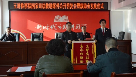 本站讯 贵州省玉屏侗族自治县人民检察院紧紧围绕“不忘初心、牢记使命”主题教育,立足检察职能,于2019年12月10日,该院举行了国家司法救助案件公开答复会暨司法救助金发放仪式。会议邀请了部分县人大代表、政协委员、律师代表参会。