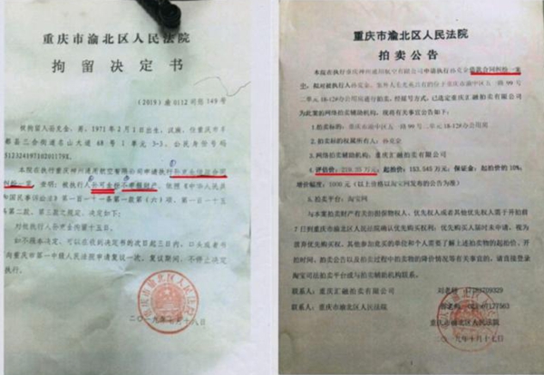 渝北法院出具的拘留决定书名字和案由错误、拍卖公告案由错误。