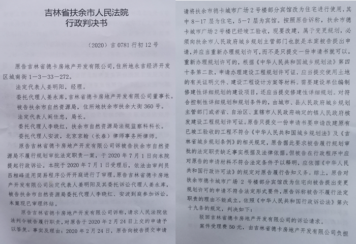 在法庭上,原告德卡公司称:2020年2月24日,原告就向被告扶余市自然资源局提交申请书一份,请求被告对原告所有的位于扶余市德卡城市广场已竣工验收完的2号楼宾馆8-17层改为住宅进行使用一事进行批示,但被告自收到该申请书至今未有任何书面或口头的回复,属严重的行政不作为。原告无奈,于7月1日,到扶余市法院对被告提起行政诉讼,请求人民法院依法支持原告的诉讼请求。