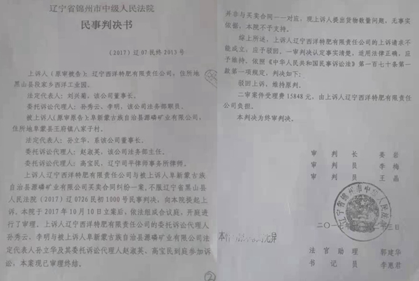 此案从头到尾也并不复杂。从2012年到2016年的五年时间里,西洋肥业从地处辽宁阜新的“源磷矿业有限公司”(简称源磷矿业)处购买原材料磷粉,五年交易额近0.8亿元,供货数量 156000 吨,欠货款总额达800余万元。到了2017年,源磷矿业方面发现,西洋肥业不仅不给付欠款,还有明显的赖帐行为,于是,一纸诉状将西洋肥业诉到法院。法院在开庭审理时,西洋肥业方面承认欠原告源磷矿业的货款,但不承认那么多,辩称在这五年的合作中,2014年和2015年他们收到的货没有那么多,应从803余万中扣掉122余万元。在法庭上,主审法官面对原告源磷矿业提供出的发票及其它一些证据,认为源磷矿业的诉求是有理有据的,而西洋肥业方面不能提供出支持自己理由的证据,所以,判决结果支持了源磷矿业的请求。但是,西洋肥业不服,又上诉到锦州市中级法院,二审法院通过仔细审理,认为一审法院判决无误,维持了原判。