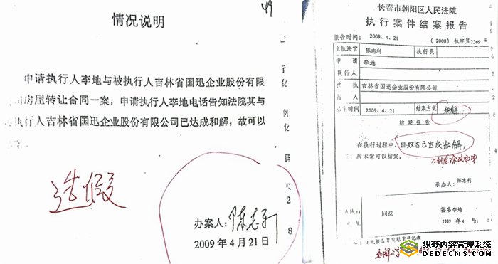 那究竟是怎么“和解”的呢?卷宗里,法官陈志利出具的一份《情况说明》是这样描述双方如何达成“和解”协议“结案”的:“申请执行人李地与被执行人吉林省国迅企业股份有限公司房屋转让合同一案,申请执行人李地电话告知法院其与被执行人吉林省国迅企业股份有限公司已达成和解,故可以结案。”也就是说,法官仅凭利益一方李地的一个电话,就认定双方已经达成了“和解”,并据此结案!这令中联公司十分震惊。
