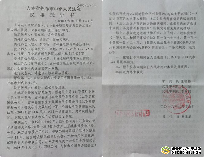中联公司认为,3544号裁定是一个明显的违法裁定,法官张奇之所以做出这一裁定,就是为法官张芳挡剑、背书。2017年10月16日,该公司再次提起上诉。长春市中级法院于2018年3月15日做出(2018)吉01民终1301号民事裁定书,该裁定书称: