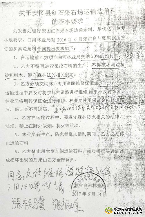 《关于安图县红石采石场运输边角料的基本要求》中,白河林业局与张振峰、张轶骥约定:“为处理好采石场(即红石采石场)的边角料(即白河林业局与莱州石材厂开采、加工石料后形成的花岗岩边角料),尽快的恢复林地要求,白河林业局对2016年6月张轶骥与张洪良签订的买卖边角料的合同提出如下要求: