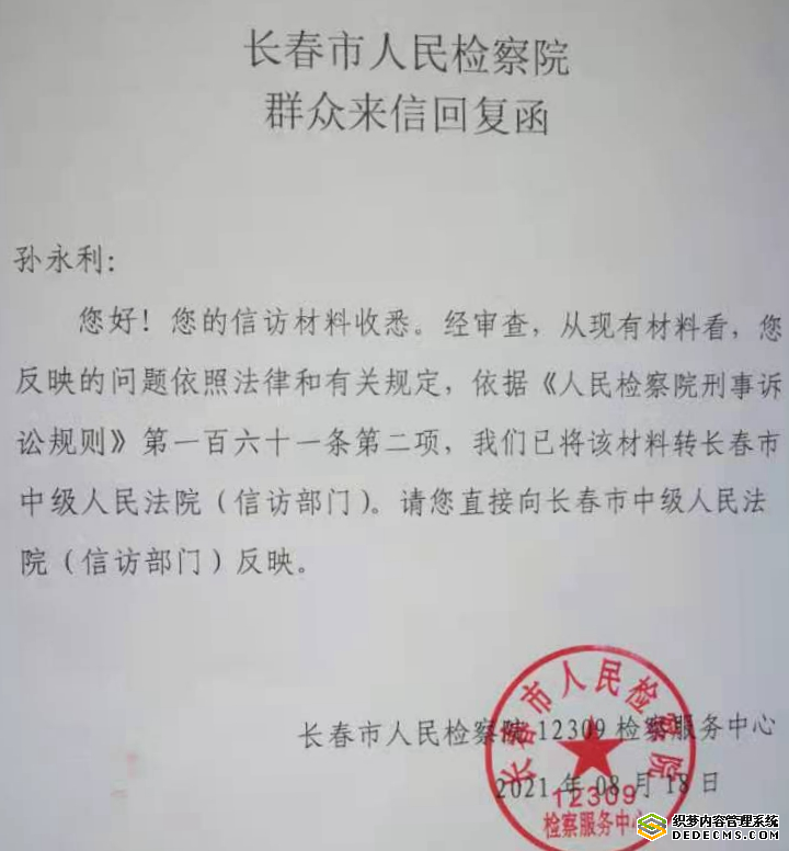 2021年8月18日,孙永利接到长春市人民检察院的《群众来信回复函》,该回复函称:“经审查,从现有材料看,您反映的问题依照法律和有关规定,依据《人民检察院刑事诉讼规则》第一百六十一条第二项,我们已将该材料转长春市中级人民法院(信访部门),请您直接向长春市中级法院(信访部门)反映。”孙永利气愤的说:我实名举报原长春市中级法院、现吉林省高级人民法院法官董惟祎枉法裁判,长春市检察院却将董惟祎案直接变成了信访案件,把皮球踢给长春市中级法院,而省高院竟然公开包庇,竟称董惟祎在办理我的案子中不存在违规问题,这明显是在包庇法官,我一定要举报到底,直到董惟祎和包庇她的人都受到严惩!