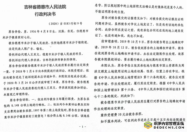 尽管米沙子镇国土资源管理分局的《说明》证明了李俭的说法,但德惠市国土局和米沙子镇政府却死不认账,也不给确权。为了维护自己的合法权益,李俭向德惠市法院提起了行政告诉。