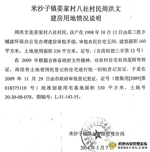 米沙子镇国土资源管理分局出具的《建房用地情况说明》证明:“周洪文是姜家村八社村民,该户在1998年10月12日由原三胜乡城建环保办公室办理建房审批手续,审批农民住宅五间,建筑面积160平方米,土地使用面积330平方米。证号:(吉房权德三字第12号)。在2009年根据吉林省政府文件精神,对农村住宅有房屋所有权证,而没有土地使用权登记的住宅进行统一初始登记发证,于是在2009年11月29日由市政府审批登记发证,证号(德集用[2009]第018375110号)批准划拨用宅基地面积330平方米,土地号20-20-08-078,图幅号:L-51-143-55。”