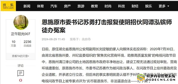 日前,原任湖北省恩施州公安局副局长刘定敏的家人向媒体实名投诉称:2020年7月30日,由湖北省恩施州委、州纪监委组织的“聚焦优化营商环境,助推高质量发展”的电视问政节目中,恩施州清江缘公司的土地因恩施市政府非净地出让,建设工程无法通过规划审批,营商环境遭重创,原恩施市市长、市委书记苏勇作为被问政当事人,在问政节目上给州委政府及企业道歉,并承诺立行立改,但后来的事实表明就是认错不予纠错,清江缘公司土地问题在电视问政节目上被专家点评为“劣币驱逐良币、非法逼退合法——灯下黑”。