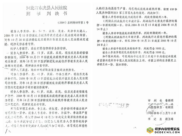 据判决书记载:对于东光县法院的指控,几名被告人均不认罪。被告人李秀珍辩称:我认为我没有冲击法庭,也没有骂任何人。我的行为不构成扰乱法庭秩序罪。其辩护人提交的辩护意见是:
