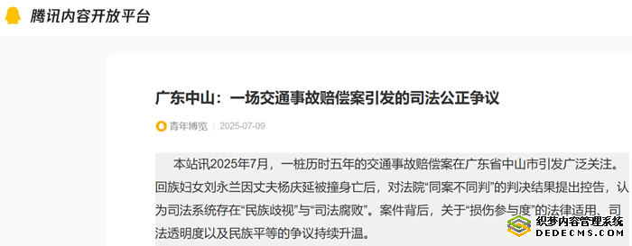 本站讯 2025年7月,一桩历时五年的交通事故赔偿案在广东省中山市引发广泛关注。回族妇女刘永兰因丈夫杨庆延被撞身亡后,对法院“同案不同判”的判决结果提出控告,认为司法系统存在“民族歧视”与“司法腐败”。案件背后,关于“损伤参与度”的法律适用、司法透明度以及民族平等的争议持续升温。