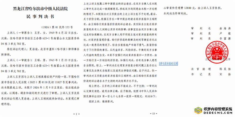 本站讯 2026年2月3日,王芳接到黑龙江省哈尔滨市中级法院作出的(2026)黑01民终155号终审判决,这一纸判决,再次让她陷入了长久的郁闷之中。她说,离婚时协议约定的是房产按份共有,但是离婚六年后房产仍然无法分割,令她陷入自身合法权益难以保障的尴尬境地。她认为法院援引处分共有物的法律规定作出的判决,混淆了“分割共有物”与“处分共有物”的核心法律概念,属于法律适用根本性错误。目前,王芳已向黑龙江省高级法院提起再审申请,希望能纠正原审错判,依法分割房产。
