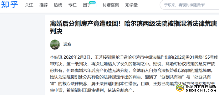 目前,王芳已向黑龙江省高级法院提交再审申请书,提出三项核心请求:依法撤销香坊区法院(2025)黑0110民初11827号民事判决第二项及诉讼费相关判决,撤销哈尔滨市中级法院(2026)黑01民终155号判决,依法将该案发回重审或直接改判。同时,王芳还请求再审法院按照《民法典》规定,以实物分割、折价分割或变价分割的方式,对案涉按份共有房产作出分割裁判,并由王琢承担本案一、二审的诉讼费用。