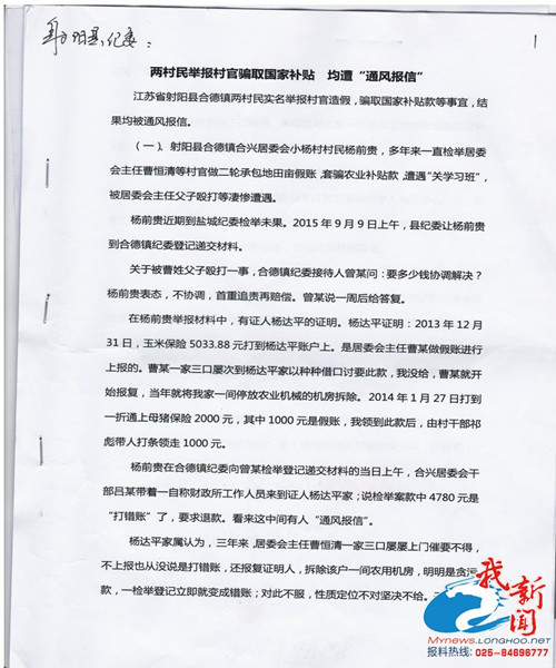 江苏省射阳县合德镇村民杨前贵、顾志文等实名向镇、县两级纪委举报,村(居)干部对上隐瞒实情,虚报、做假账,对下以给村民发“工资”方式,将虚报土地面积套骗来的“农业补贴资金”收回,以及打击报复举报人等问题。