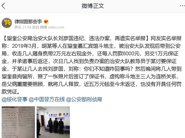 【望奎公安局治安大队长刘彦国违纪、违法办案,再遭实名举报】网友实名举报称:2019年3月,胡某等人在望奎嘉汇宾馆斗地主,被治安大队发现后带到公安局,收走几人随身携带2万元左右现金外,还每人罚款6000元,另交1万元保证金,并承诺事后返还,次日几人找到负责办案的治安大队教导员于某讨要保证金,于某让几人去找刘彦国,刘称:你们不知道咋回事吗?然后晚间将几人带到望奎县拘留所,照了一张照片后签订了保证书,虚构称斗地主三人为连桥关系,岳父病重需要照顾,就将几人释放,近五万元钱至今未返还,也没有开具任何罚款凭证。