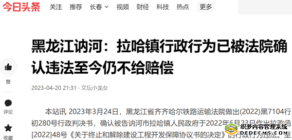 拉哈镇行政行为已被法院确认违法至今仍不给赔偿: https://mbd.baidu.com/newspage/data/landingshare?preview=1&pageType=1&isBdboxFrom=1&context={"nid":"news_9225052820615171175","sourceFrom":"bjh"}&sShare=1]