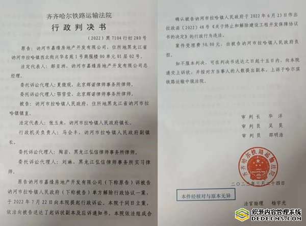 本站讯 2023年3月24日,黑龙江省齐齐哈尔铁路运输法院做出(2022)黑7104行初280号行政判决书,确认被告讷河市拉哈镇人民政府于2022年6月23日作出拉政函[2022]48号《关于终止和解除建设工程开发保障协议书的决定》的行政行为违法。至此,自2022年八九月以来,在网上闹得沸沸扬扬的拉哈镇一号地段棚改项目争议,终于有了一个法律上的初步结论,原告讷河市嘉缘房地产开发有限公司(下称嘉缘公司)胜诉。然而,拉哈镇政府仍然一拖再拖,不肯给付嘉缘公司赔偿。日前,嘉缘公司愤然实名举报当地政府官员曾经索贿,当地纪检委已经受理举报。