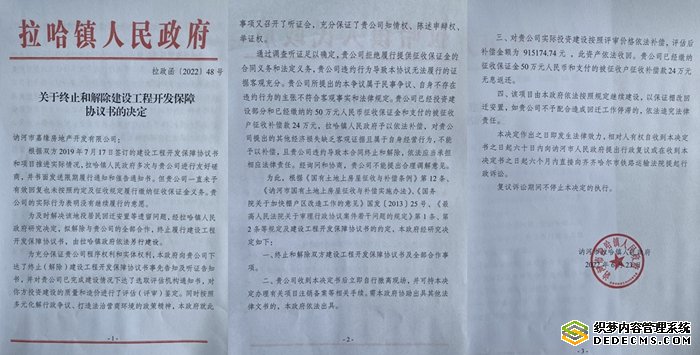 拉哈镇政府做出的《拉哈镇人民政府关于终止和解除建设工程开发保障协议书的决定》(拉政函【2022】48号)则称:“根据双方2019年7月17日签订的建设工程开发保障协议书和项目推进实际情况,拉哈镇人民政府多次与贵公司进行友好磋商,并书面发送限期履行通知和催告通知书。但贵公司一直未予有效回复也未按照约定及征收规定履行缴纳征收保证金义务。贵公司的实际行为表明没有继续履行的意愿。为及时解决该地段居民回迁安置等遗留问题,经拉哈镇人民政府研究决定,拟解除与贵公司的全部合作,终止履行建设工程开发保障协议书,由拉哈镇政府依法另行建设。”