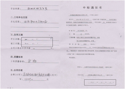 最令人费解的是,这份迟来的《协议书》墨迹未干,一份后补的《中标通知书》落款时间也签写:“2014年10月21日”。长春市双阳区鹿乡镇“村村通”工程项目“儿比娘早”离谱现象接二连三发生着。据记者调查:2014年9月28日,该工程已经竣工,长春市双阳区鹿乡镇育民村、信家村屯路建设项目01、02标段《工程公告》姗姗来迟,公告中标注“建设期:2014年10月20日,竣工日期:2014年11月30日。”透过工程项目背后一连串离谱现象,令人费解,让人产生质疑:是什么导致一连串工程程序“变异”的病因?