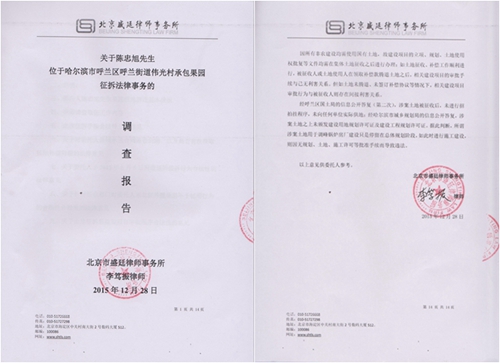 本站讯 自2015年8月以来,黑龙江省哈尔滨市呼兰区再次成为各大网络媒体关注的热点、焦点:呼兰区政府在没有履行任何合法程序的情况下,强行拆毁伟光果园,百 亩绿油油的果园即刻成为废墟,为此各大网络媒体曾经先后以《哈尔滨呼兰区再现暴力强拆 百亩果园被毁》、《哈尔滨呼兰区:百亩果园被强行摧毁后至今仍在哭泣!》 为题进行了广泛报道。日前,此事又有了新的进展——北京市盛廷律师事务所律师经过认真、详细的调查发现:此次征拆根本没有履行正常的征地拆迁批准手续,纯 粹是一次违法征拆!