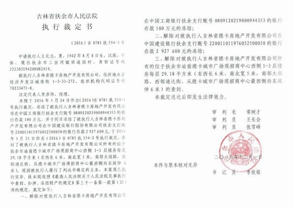 本站讯 2018年元旦刚过,吉林省德卡房地产集团有限公司老总李彦伟接到银行通知:贵企业有很多不良信息,将影响企业信用等级。李彦伟去银行一查,竟然发现:早在一年前就已经了结的官司,而且法院也做出了解冻裁定,可是法院至今也没有给撤销查封信息!更令他吃惊的是,5年前已经了解的官司,至今也没有撤销查封信息。他去找办案法官理论,对方居然回答:我们整不了,你们公司自己想办法去消掉!