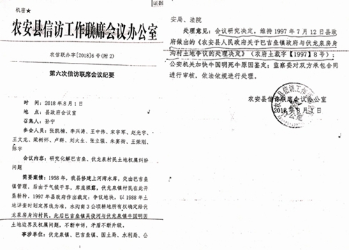 2008年8月1日,农安县政府专门召开了信访工作第六次联席会议,决定维持1997年7月12日县政府做出的农府土裁字(1997)8号裁定。此次信访联席会议再次确定了巴吉垒镇政府对库区地的管理经营权,也就是再次确认了吴俊和承包库区地的合法性。但是,农安县法院至今仍没有执行回转。