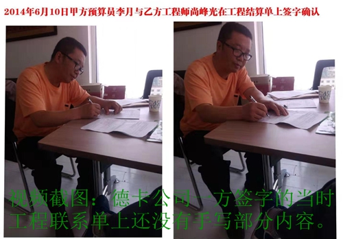 德卡公司一方以为没啥,就同意了,但为了以防万一,在签字时特意做了录像。令德卡一方没有想到的是,第二天,等王晶一方签完字、盖完公章拿回来后,却发现本来是打印的工程联系单上居然多了手写的内容,王晶在工程联系单上填上了“截至到今日,减去历年付款,尚欠施工单位人民币:陆佰肆拾万零叁仟元整”的字样,而且在德卡公司一方还有公司地产经理李彦伟和总工李月签字的“同意”两字。姜先生感到蹊跷,马上就追问李彦伟和李月,二人均称没有在此处签过字。姜先生认为这肯定是王晶做了手脚,是他擅自模仿添加上去的。