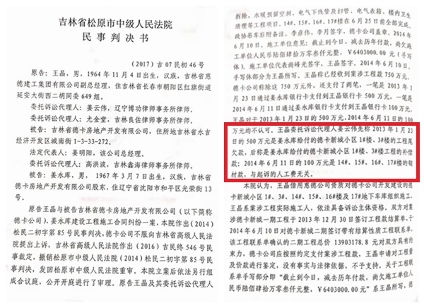 眼看着这两招不灵以后,王晶又于2015年5月,将德卡公司起诉至松原市中级人民法院,要求德卡公司给付他们的工程款640.3万元及利息。