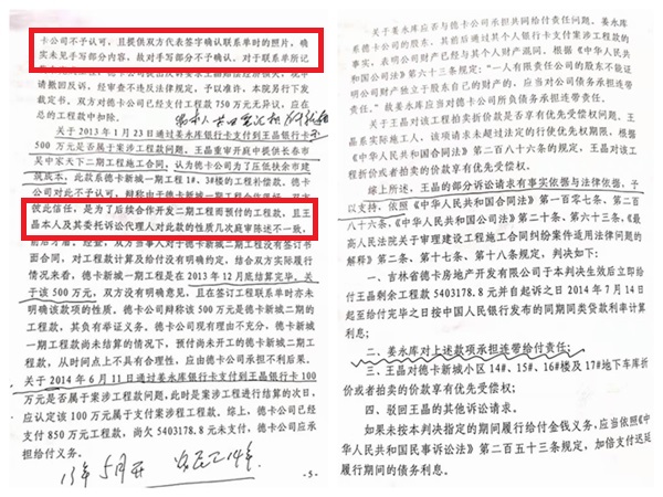而姜先生则称:一审法院因为打款的时间而对500万元不予认定是错误的。王晶一方所说的有相关材料能够证明该笔款项是额外补偿款,其材料就是他们拿长春吴中家天下的施工价格作为扶余的价格,就这样推算出来的所谓额外补偿款。在德卡新城施工的企业有四家,四家都是相同的价格,也没有任何额外补偿,扶余的施工价格请法院调查是否与长春施工价格一致。众所周知,长春吴中家天下的施工价格和扶余有天仰之别,拿长春的施工价格作为认定扶余的施工价格,纯粹就是无稽之谈。