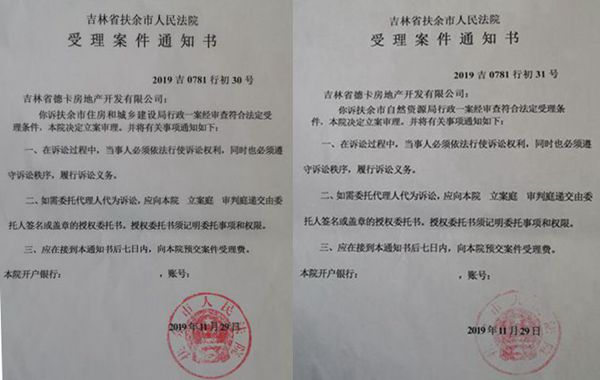 本站讯 2019年11月29日,对于在吉林省42个县级经济体排名第36位的扶余市来说,或许是个令人很没面子的日子:这一天,德卡公司认为由于两个部门向法庭出具了虚假证明材料,导致其在14起房产纠纷官司中败诉,愤然向当地法院提起行政诉讼,将扶余市住建局和自然资源局(国土资源局)告上法庭。扶余市法院当日同时受理了德卡公司的两个起诉状。这,在吉林省乃至扶余市的历史上,当属史无前例!在举国上下一片呼声营造法制化营商环境的大背景下,德卡公司的这一举动或许有着非同凡响的意义。