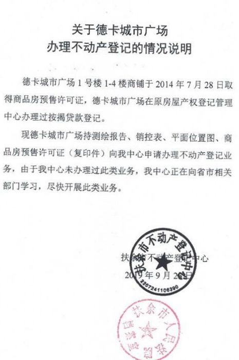 ——上诉人所举2016年的房产证及2019年的不动产登记可以证明,从上诉人处购买商铺的购买人在2016年和2019年已经办理3户产权证照或不动产登记证,至于有时不能办理产权登记或不动产登记的原因则是政府职能部门不作为甚至违法行政造成的。扶余市政府扶住建字(2019)69号信访事项处理意见书的答复说德卡公司商业部分未验收和德卡公司欠土地出让金1980万元,超建筑面积6万多平方,这是虚假证明。真实的情况是:德卡新城商业部分消防早在2017年2月27日就已验收完毕,而出让金上诉人也并不欠缴。德卡公司的土地使用权出让合同、建设工程规划许可证、扶余市发展和改革局文件[2015]88号)的批复是一致的,都是122900平方米,以上两份政府文件均证明德卡公司没有超建筑总面积。