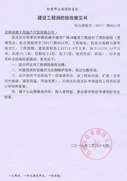 ——扶余市法院一审判决说德卡城市广场开业时间是2016年9月16日,至今有三年时间,德卡城市广场的商铺至今不能办理产权。按照认购协议书中第六大项第二条,产权证办理日期即商场开业一年后办理产权证,也就是说在2017年9月16日就可以办理产权证。德卡公司在2017年4月27日就办理了竣工备案证,2017年2月27日办理了消防验收合格证,之后就将相关手续一并交于房产处。实际上,购买德卡城市广场不仅可以办理,而且实际上已经有一些买房户办理了产权证,如杜长军、杜岩、汪井霞等。