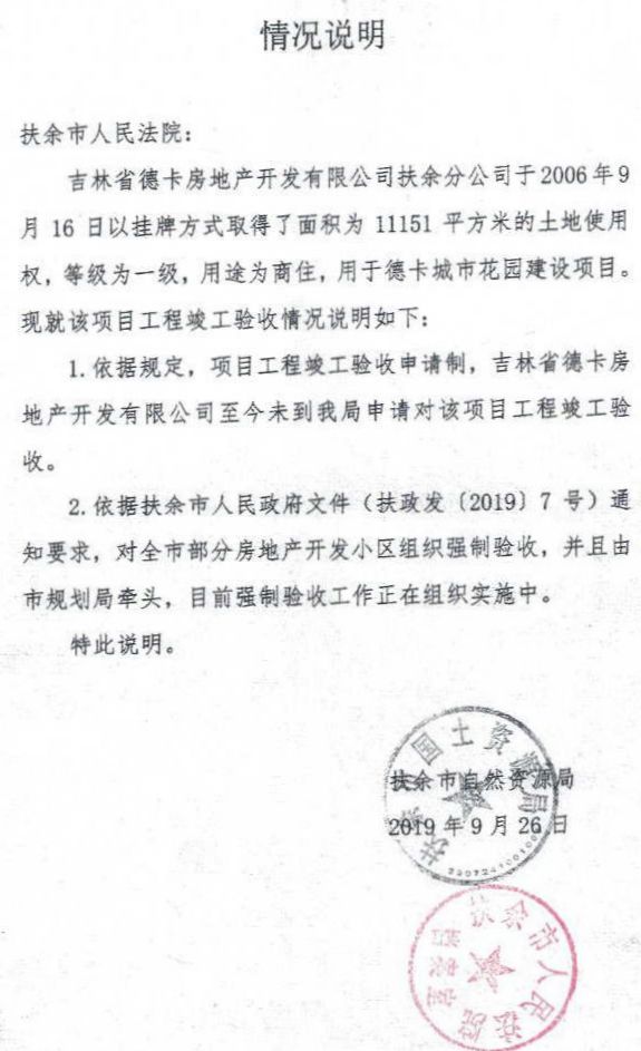 在起诉书中,德卡公司称:扶余市自然资源局(国土资源局)于2019年9月26日,给扶余市法院出具了《情况说明》。该《情况说明》不以事实为根据,称德卡时代购物广场应追缴土地出让金1980.40万元,其内容与事实不符;扶余市住房和城乡建设局于2019年3月19日,给扶余市法院出具了《信访事项处理意见书》。该《信访事项处理意见书》内容与事实不符,谎称德卡公司开发的扶余市德卡城市广场消防商业部分未验收,欠缴土地出让金。起诉书称:由于这两个部门出具了虚假的证明材料,致使购买原告开发商铺的购买人与原告的买卖合同被法院判决解除,被告的行为严重侵害了原告的合法权益,给原告造成了重大经济和名誉损失。