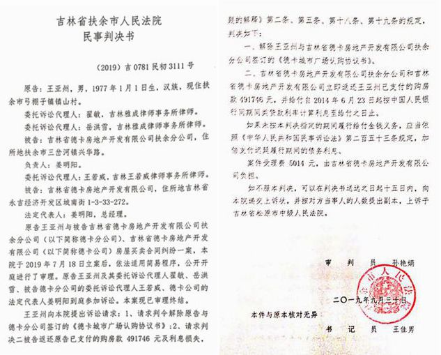 法院依据以上证据、说明,认定“德卡公司并不是构成迟延办证的违约贵任,而是构成不能办证的违约责任,从而构成根本违约,导致原告的合同目的无法实现。”扶余市法院最后判决:一,解除王亚州与吉林省德卡房地产开发有限公司扶余分公司签订的《德卡城市广场认购协议书》;二,吉林省德卡房地产开发有限公司扶余分公司和吉林省德卡房地产开发有限公司立即返还王亚州已支付的购房款491746元,并给付自2014年6月23日起按中国人民银行同期同类贷款利率计算利息至给付之日止……