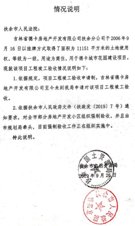 在起诉书中,德卡公司称:扶余市自然资源局于2019年9月26日,给扶余市法院出具了《情况说明》。该《情况说明》说德卡公司至今未到我局申请对该项目工程竣工验收,其内容与事实不符。扶余市住房和城乡建设局于2019年3月19日,给扶余市法院出具了《信访事项处理意见书》。该《意见书》内容造假,谎称德卡公司开发的城市广场消防商业部分未验收,欠缴土地出让金和超建筑面积。起诉书并称:由于这两个部门出具了虚假的证明材料,致使购买原告开发商铺的购买人与原告的买卖合同被法院判决解除,被告的行为严重侵害了原告的合法权益,给原告造成了重大经济和名誉损失。