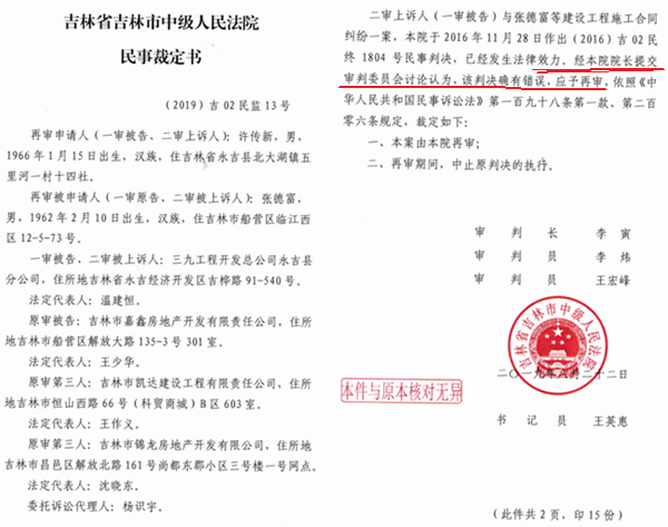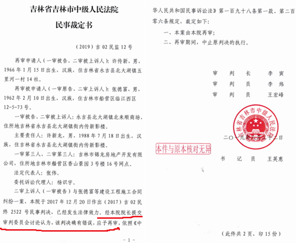至此,许传新的司法程序已经穷尽,该是给付工程款的时候了。但是,张德富万万没有想到的是,2019年8月22日,他突然接到吉林市中法(2019)吉02民监12、13号民事裁定书,以“院长发现”该上述两个判决“确有错误”,应予再审为由裁定再审,但是这两个裁定却并没有说明究竟确有什么错误、错在何处。吉林市中院遂于2019年12月5日开庭审理了北来顺商场案,12月9日作出了(2019)吉02民再52号民事裁定书,一举撤销了(2017)吉02民终2522号及永吉法院(2017)吉0221民初5号判决,发回永吉县人民法院重审!